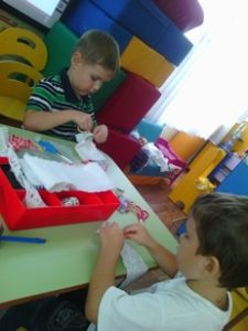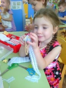 В старшем дошкольном возрасте ведущим является наглядно-образное мышление. А образы, порождающие мыслительные процессы, дети черпают из окружающей жизни. Поэтому мы совершаем много познавательных путешествий – экскурсий в окружающие нас разные жизненные сферы. Они-то и являются источников развития новых познавательных интересов моих ребят. Например, экскурсия в магазин одежды породила интерес к тканям, к шитью, и у нас появился центр рукоделия «Мастерица», в котором с удовольствием трудятся не только девочки, но и мальчики. Они с огромным интересом осваивают основы рукоделия. Дети средней группы умеют кроить и шить несложные вещи, например, мешочки для своих секретов, украшать свои изделия тесьмой.