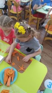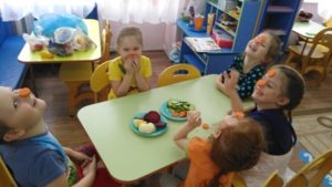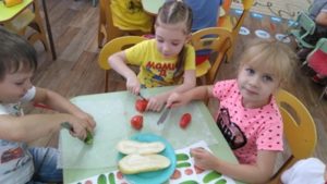 Так, основой для выбора темы «Овощи» послужили фотографии, которые принесли родители. На них были запечатлены дети, помогающие собирать урожай. Малыши с большим интересом рассматривали фотографии и рассказывали, как помогали маме и папе работать на огороде. Педагоги с детьми не только рассматривали овощи на фотографии, но и «исследовали» настоящие овощи: какие они по вкусу, форме, весу и т.д. Отвечая на вопрос «Как сделать салат из огурцов?», дети узнали, что овощи имеют разный запах, цвет и размер. Таким образом, несмотря на ранний возраст воспитанников, педагоги видят детский интерес и поддерживают детскую активность в разных видах деятельности.